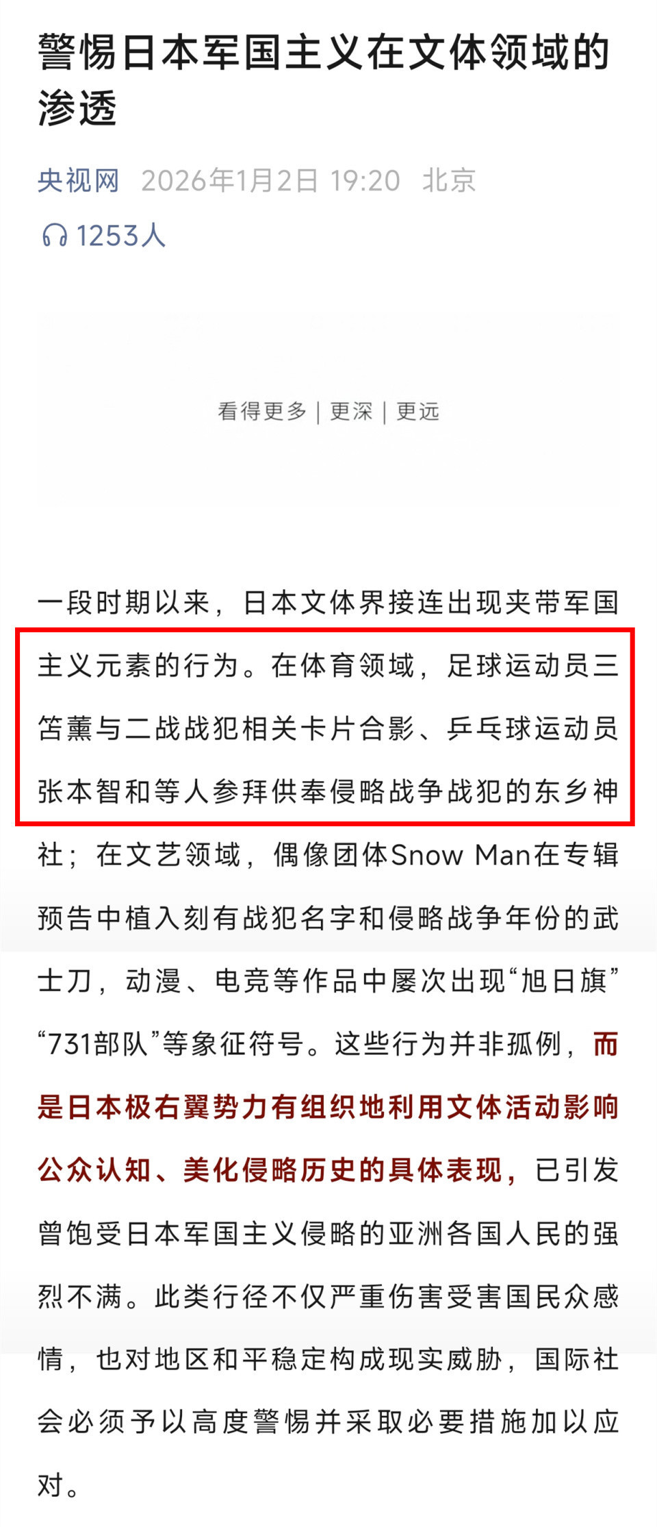 这种批判并非望风捕影,日本右翼势力连年平庸诳骗文学行径浸透军国目的想想:足球融会员三笘薰与战犯卡片合影、偶像团体SnowMan在MV中植入侵扰干戈标记,张本智和的步履,恰是这一系统性浸透的缩影,他试图以政事表态疏浚日本社会招供,却不知我方早已沦为意志阵势的棋子